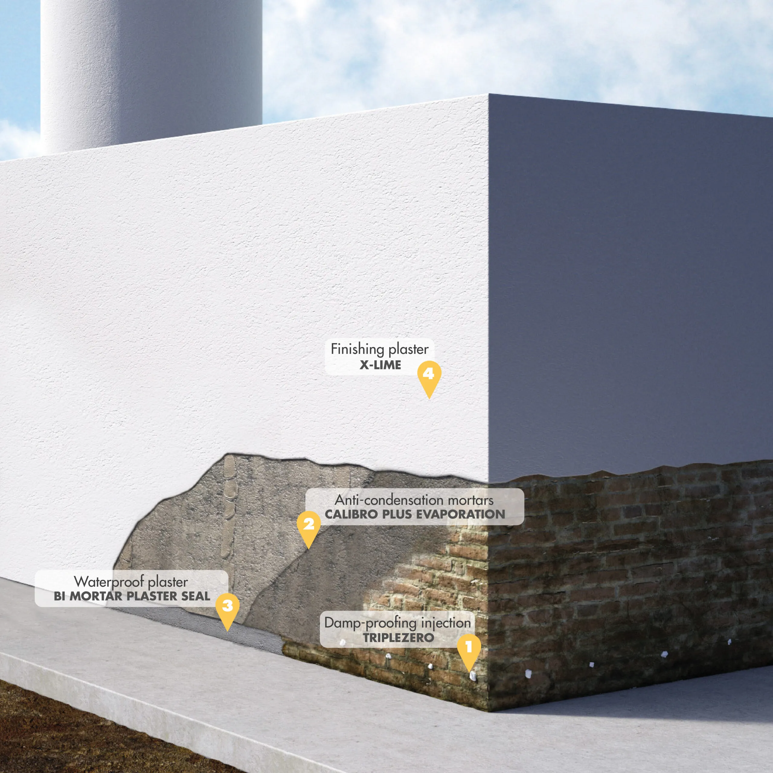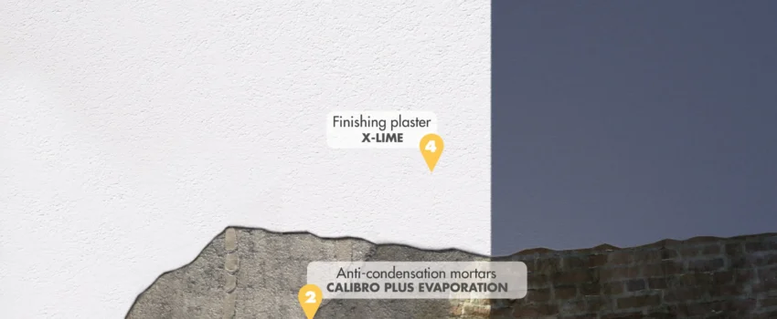 Chemická bariéra a sanačný vápenný omietkový systém vysoko odolný proti vlhkosti v murive-komplexná ochrana proti zemnej – kapilárne vzlínajúcej vlhkosti, kondenzácii, soľných výkvetov v murive akéhokoľvek zloženia (kameň, tehla, betón).